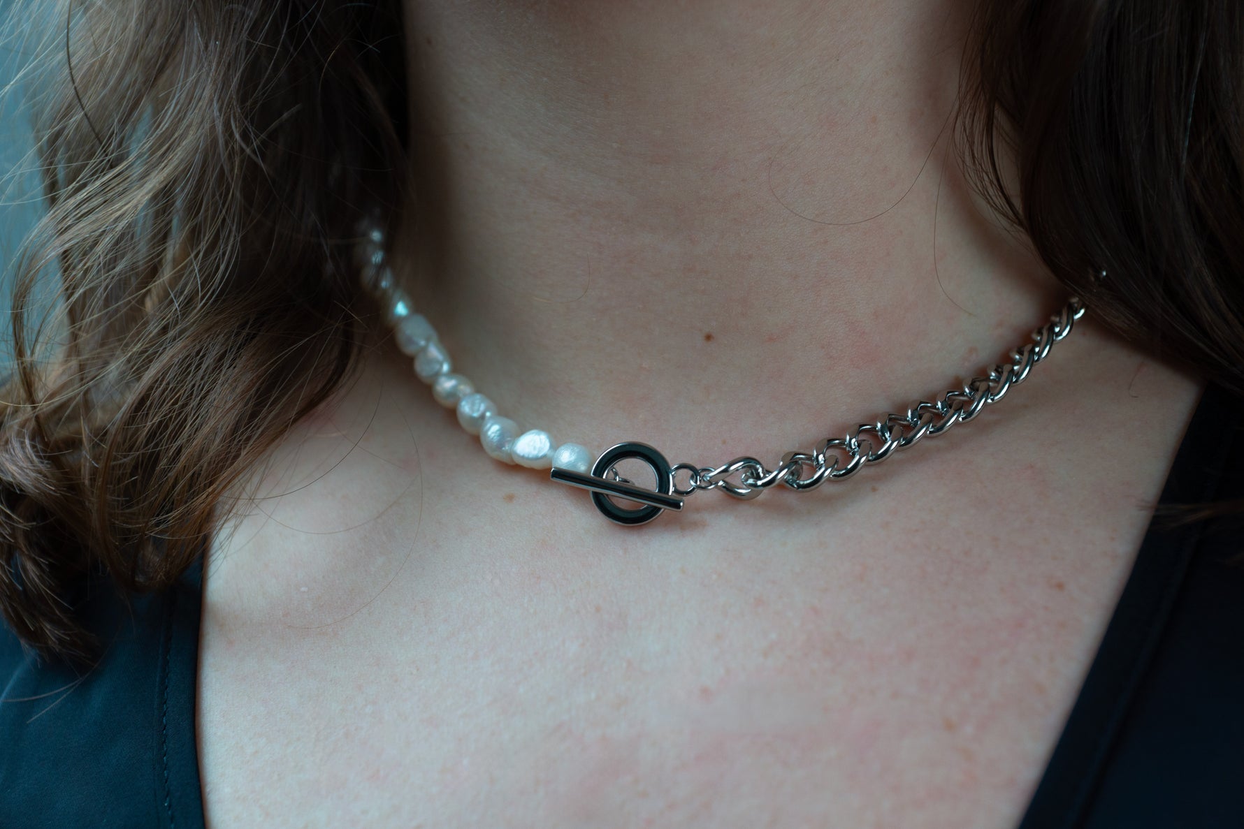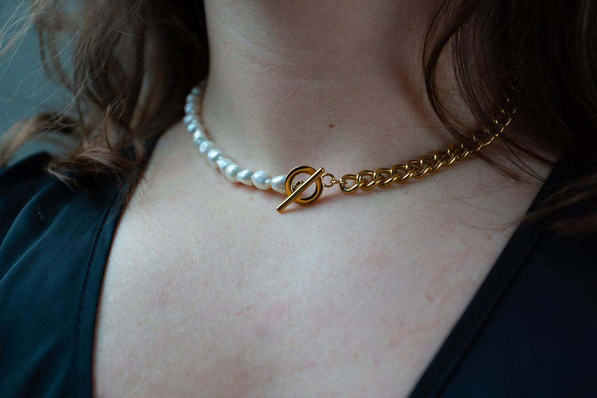 🤍 Le collier Élina célèbre l’équilibre entre modernité et douceur. Sa composition mêle une chaîne argentée au design contemporain à une rangée de véritables perles d’eau douce, chacune choisie pour sa forme naturelle et son éclat nacré unique.